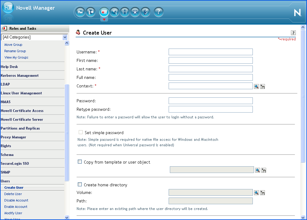 Select to create a user based on an existing template or user object. When copying from a user object, iManager allows only a copy of the new object’s eDirectory rights instead of a copy of all eDirectory rights, to prevent users from receiving the same rights as the administrator.