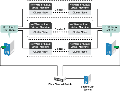 In this scenario, you have OES 2 Linux (Xen) installed and configured on each node (physical machine). You then create multiple NetWare or Linux virtual machines on each physical machine and install and configure Novell Cluster Services on each virtual machine. During the Novell Cluster Services installation, you create separate clusters of virtual cluster nodes, with each virtual cluster node residing on a separate physical machine. This way you have multiple clusters of virtual cluster nodes on fewer physical machines.