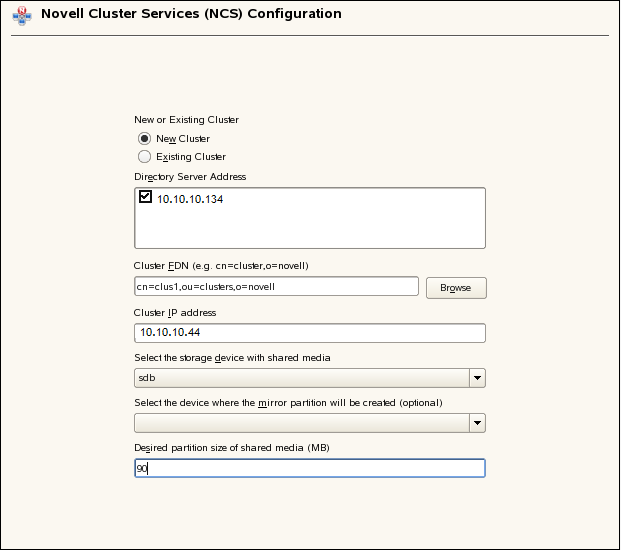 Go to the Novell Cluster Services Configuration page as described in Section 5.5.4, Accessing the Novell Cluster Services Configuration Page in YaST.