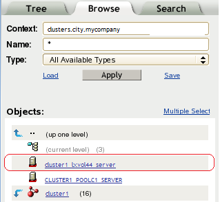 Browse to the Cluster container to see the virtual server object for the cluster resource, such as cluster1_lxvol44_server.