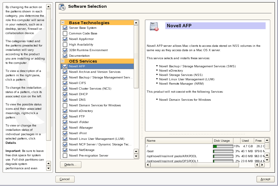 YaST uses a predefined system of installing components along with the associated dependencies. For a service to function properly, all the dependent products must be installed. Pattern deployment provides patterns for different services. Selecting a pattern automatically selects and installs its dependencies.