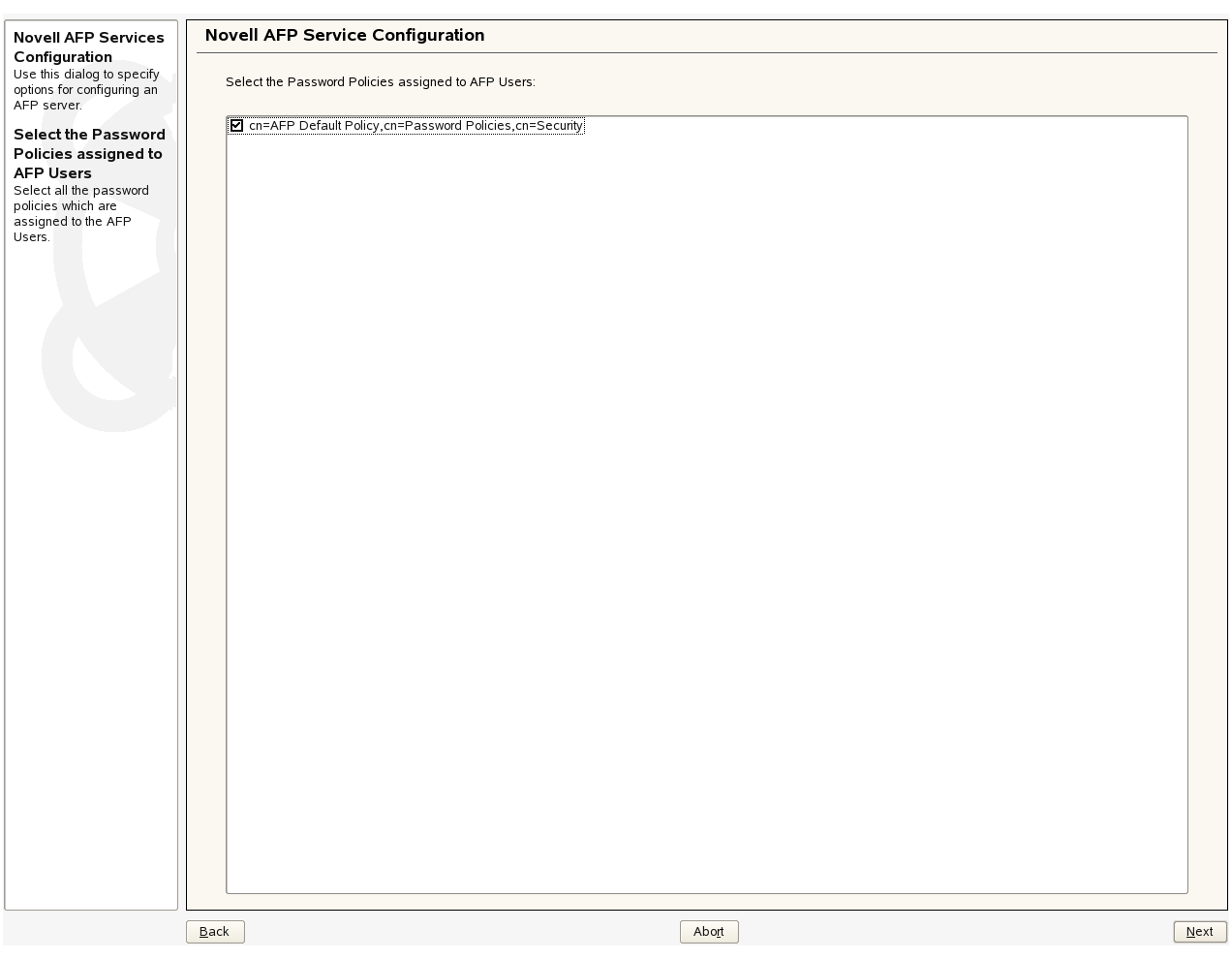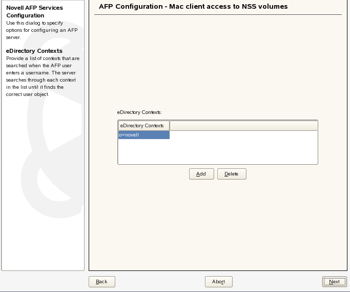 To configure the AFP service, select the eDirectory context on the Configuration page.