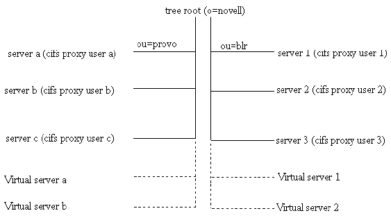 The , , and have the rights to read the eDirectory CIFS attributes under ( and ). Hence if these virtual servers are hosted in any of these three nodes, the configuration is read by the CIFS service in the corresponding node. |
