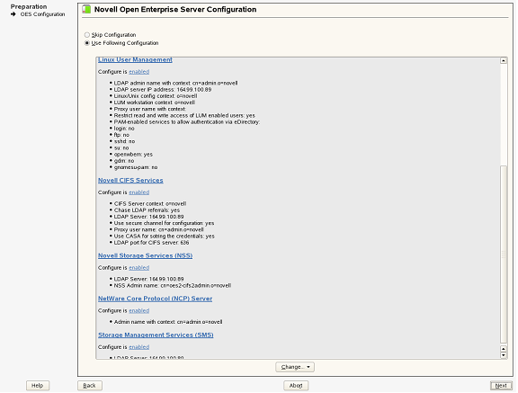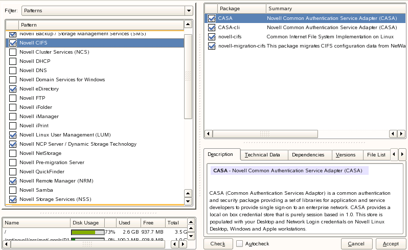 IMPORTANT:By default, the CIFS dependency packages are selected: Novell eDirectory, Novell Linux User Management (LUM), NetWare Core Protocol Server (NCP), Novell Remote Manager (NRM), and Novell Storage Services (NSS), in addition to other OES 2 SP3 default dependencies or other services dependency packages.