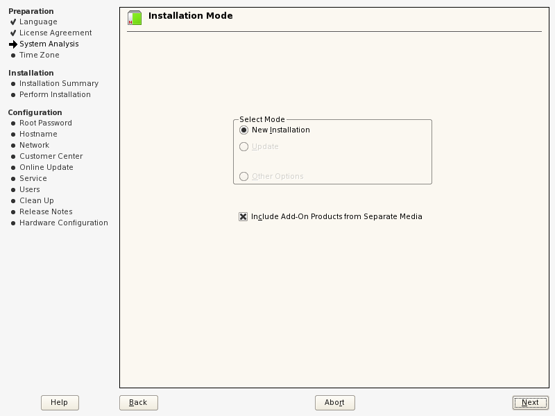 When the Installation Mode page displays, select the following two menu options, then click Next: