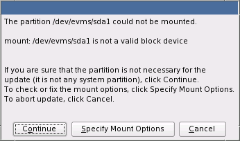 HINT:If you have the disk driver situation mentioned in Step 8, your server boots to a prompt for the root password. Specify the password, and then use an editor such as VI to modify the /etc/fstab file so that the path to the boot partition uses sda instead of hda. Then reboot the server. The upgrade should continue normally.