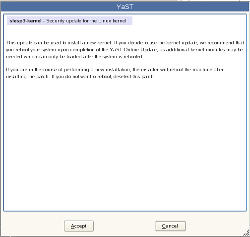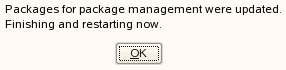 If the update makes changes to YaST, the following message displays. If so, click to restart YaST.