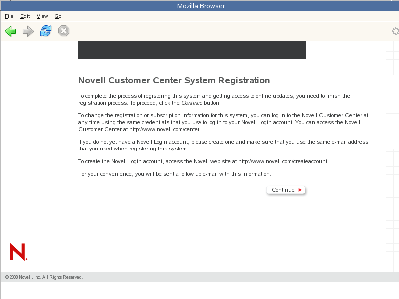 To receive support and updates for your OES 2 SP3 server, you need to register it in the Novell Customer Center. When the Novell Customer Center Configuration page is displayed, you have three options: