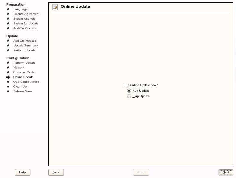 If you have a successful connection to the Internet and have registered the server in the Novell Customer Center, the server displays the Online Update page. You can run the online update now or skip it and get updates later.