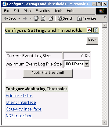 Use the Configure Settings and Thresholds page to modify the default settings for the Print Services Manger Health Monitor. For most print systems, you do not need to change the default settings. This link is accessible only to managers of the iPrint Manager. For other users, or if you are not logged in, this link is not displayed.