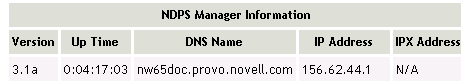 Displays information about this iPrint Manager, including its version, how long it has been loaded on the server, associated DNS name, IP address, and IPX™ address.