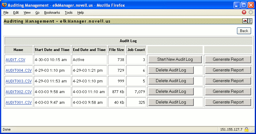 You can manage your audit logs by using the buttons on the Auditing Management page. When audit logs are no longer needed, you can manually delete them. To automatically save and create new logs, see Configuring Automatic Log Rotation.