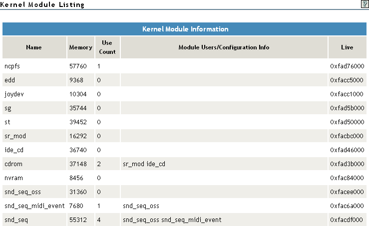 Clicking the View Kernel Modules link in the navigation frame displays the Kernel Module Listing page. On this page you can view the status of the modules that have been compiled into the Linux kernel on this system. Printing this page can be useful to document your system as you make changes or upgrades to it in the future.
