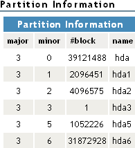 If you need to get information about how a partition is laid out, you can get this information from the Partition Information page. This page shows you the major and minor numbers of the partition, the number of blocks in the partition, and its name.