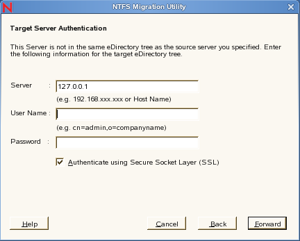 In the field, specify the fully distinguished, typeful name of a user with admin rights in the target tree.