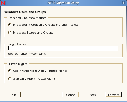 In the field, specify the container in the target eDirectory tree where you want User and Group objects to be created for the migrated Windows users and groups.