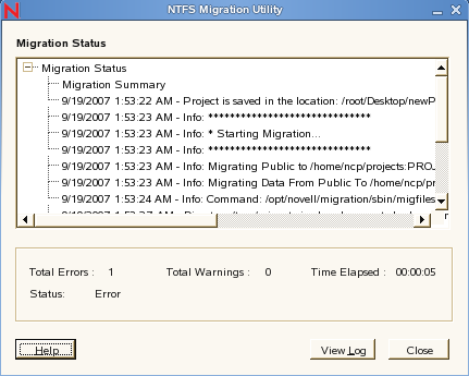 The Migration Status window displays the progress of the migration, and the field below shows the total number of errors and warnings, the time elapsed, and a status message.
