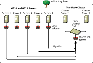 In this scenario (see Figure 1-2), you have five existing OES servers. You recently purchased two multiprocessor servers and the necessary hardware to create a two-node cluster complete with an attached Storage Area Network (SAN). You decide to install OES 2 SP3 on the two-node cluster and to copy the data from each of the five servers to the SAN on the two-node cluster. Instead of manually moving all the data and Printer Agents or backing up the data and restoring it to the SAN, you can use the Migration Tool, which automates the data migration process.