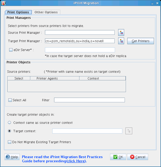 NOTE:You can run the psminfo.nlm on the source server, then copy the psminfo.xml file to the target server at the /opt/novell/iprint/share location. This avoids contacting the source server during migration.