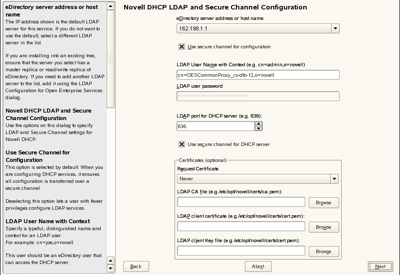 Specify a distinguished name and context for an LDAP user. For example: cn=joe, o=novell. This user should be an eDirectory user that can access the DHCP server. During eDirectory configuration, if you have selected the check box, then the proxy user and password fields are populated with common proxy user name and password. |