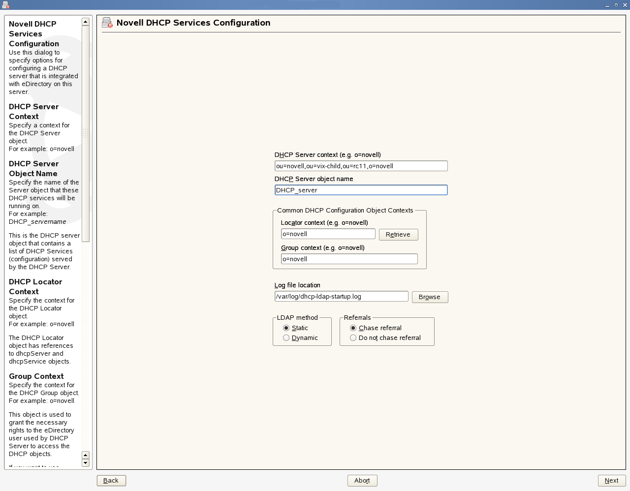 Specify a context for the DHCP Server object. For example: o=novell |