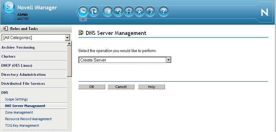 The organization of roles and tasks follows the containership rules of object creation and manipulation in DNS. For example, if you expand the DNS role on the left pane, the logical tasks this role contains appear under it. At the top is the Scope Settings task. This is followed by DNS Server Management, which allows you to specify the location of the Locator object and the administrative scope for the session. At the next level is Zone Management, which manages zones handled by DNS servers. The Resource Record Management allows you to manage resource records contained within a zone. The DNS Key Management allows you to create, modify, and delete DNS Key objects. DNS Key provides a means of authentication for dynamic DNS updates and for queries to a secured DNS Server.
