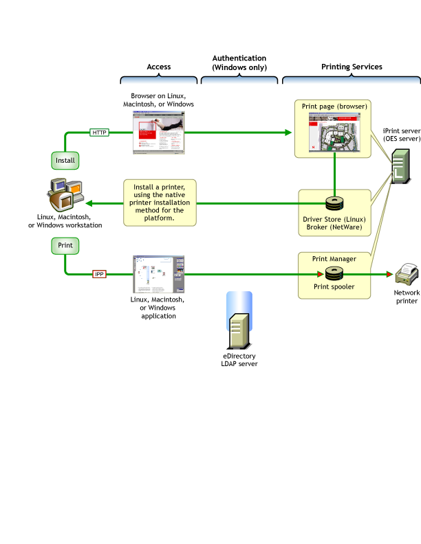 More detailed information on iPrint services in OES 2 is found in iPrint Functionality
