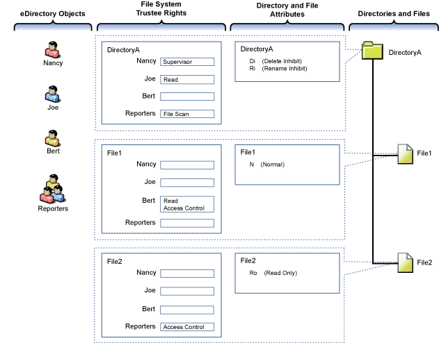 In the Novell access control model, eDirectory objects, such as users and groups, are assigned File System Trustee Rights to directories and files on NSS and NCP volumes. These trustee rights determine what the user or group can do with a directory or file, provided that the directory or file attributes allow the action.