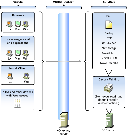 Figure 17-1 illustrates the access methods supported by OES 2 services. Novell eDirectory provides authentication to each service.