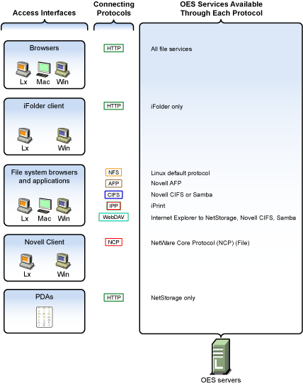 Figure 17-3 illustrates the access interfaces available to users in OES and the services that each interface can connect to. It also shows the protocols that connect access interfaces with network services.