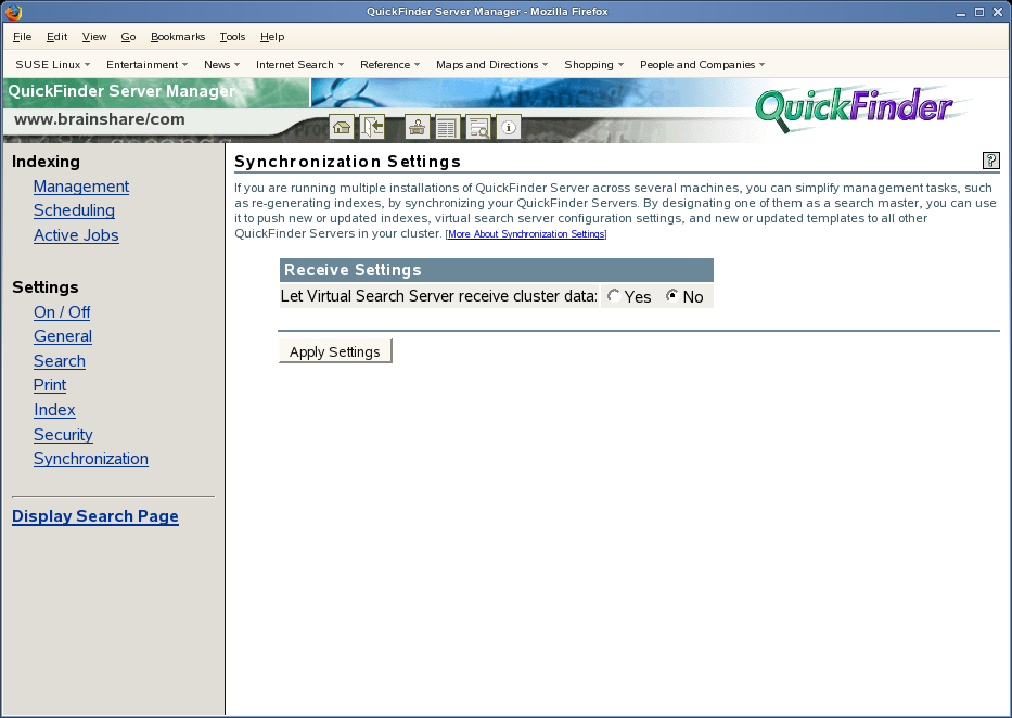 QuickFinder Synchronization lets you designate one QuickFinder server as the search master from which updated indexes, templates, and configuration settings are systematically sent out to all other QuickFinder servers defined as part of a QuickFinder Synchronization cluster.