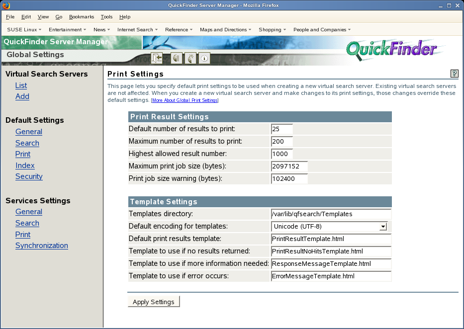 Default Print Settings lets you modify default print results and print template settings for all new virtual search servers.