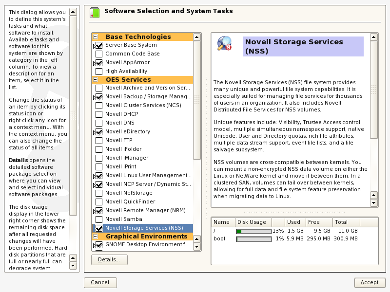 For OES 2 Linux, in the YaST install, use the menu to select from the OES Services menu. This choice automatically selects these additional OES services that are used by DFS: