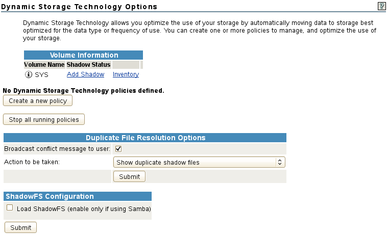 The Dynamic Storage Technology Options plug-in (shown in Figure 6-1) in Novell Remote Manager for Linux is the primary tool for configuring global policies for all DST shadow volumes, creating and managing DST shadow volumes, and configuring shadow volume policies.