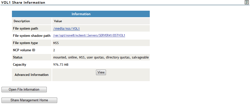 Use one of the following methods to go to the Share Information page of the NSS volume that you want to use as the primary storage area.