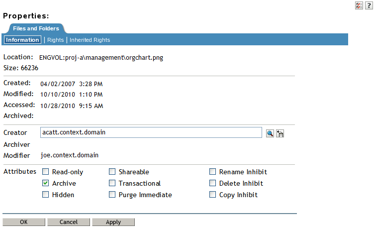 On the Properties page, click the icon, browse to locate and select the folder you want to manage on an NSS volume, then click to open the Properties page for the selected folder.
