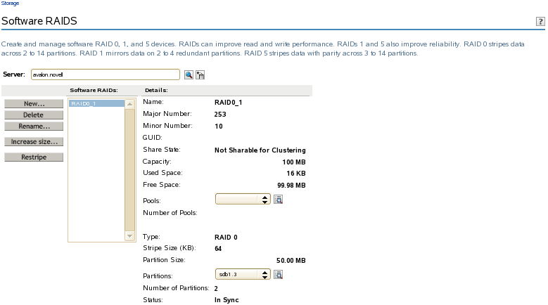 Use the Software RAIDs task in the iManager Storage plug-in to create and manage your software RAID devices.