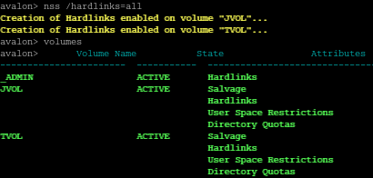 Use the commands in this section to enable or disable the Hard Links attribute for an NSS volume. The Hard Links attribute cannot be set or viewed in NSSMU or in the Storage plug-in to iManager.