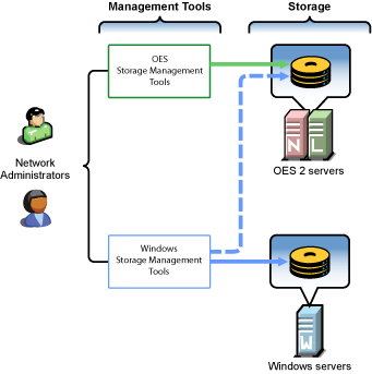 Network administrators use native OES and Windows storage management tools to create and manage storage devices on OES and Windows servers, respectively. Windows management tools can also manage share access rights and POSIX* file system rights on DSfW storage devices after the shares are created. They cannot create the shares or perform other device management tasks. |