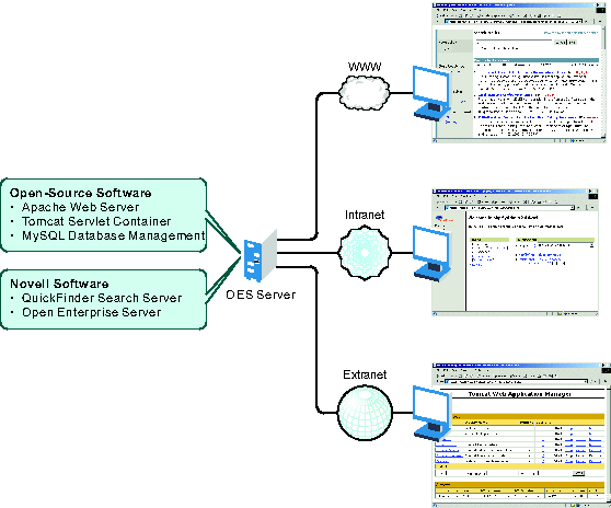 The following diagram illustrates how you can combine open source software and Novell software to provide Web-based business solutions for employees, customers, and partners.