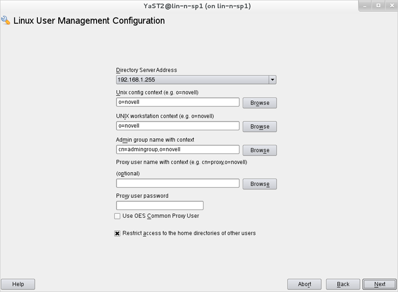 IMPORTANT:Setting up Linux User Management requires administrator rights to the container where the Linux User Management objects are created. For more information on rights, refer to Rights Required for Subcontainer Administrators