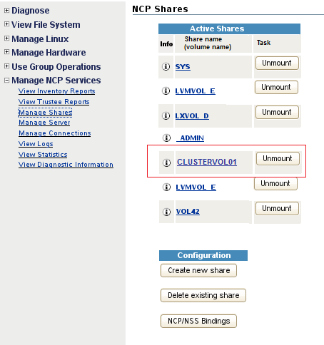 The clustered NCP volume is defined in the LVM volume group cluster resource load script. The NCP volume is mounted when you bring the resource online, and dismounted when you take the resource offline. You do not use the Mount and Unmount buttons in this interface.