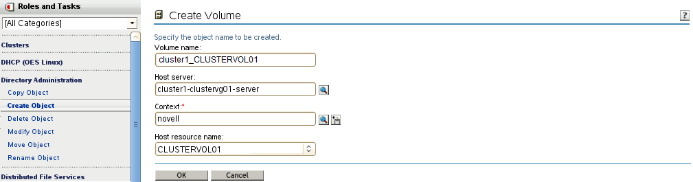 Use the following procedure to create an NCP volume object on the NCP virtual server you created in Section 14.5, Creating a Virtual Server Object for an LVM Volume Group Cluster Resource