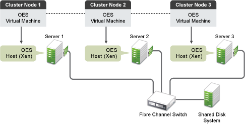 In this scenario, you have OES and Xen installed and configured on each node (physical machine). You create the OES virtual machine on each physical machine and install and configure Novell Cluster Services on each virtual machine. The combined virtual machines (cluster nodes) comprise one cluster.