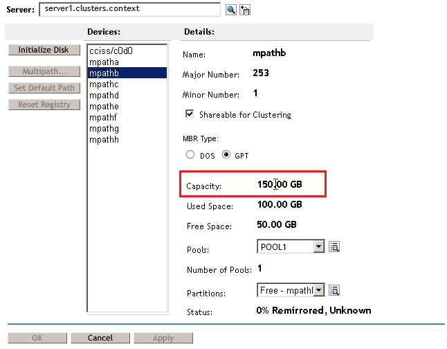 For example, the mpathb device’s Capacity field reports a size of 150 GB.