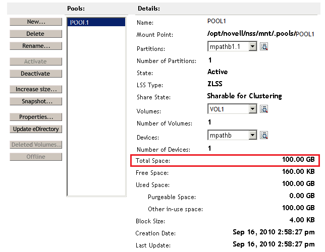 NSS pools are made up of segments of space from one or more devices up to a maximum total size of 8 TB (terabytes). Each device can be up to 2 TB in size if a DOS partitioning scheme is used, or up to 8 TB in size if a GPT partitioning scheme is used. You can expand a pool by adding more space from the same device or from a different shared device. If you extend the size of a LUN device that is currently being used by the pool, you must make the extended size visible to all nodes in the cluster before you add the newly available space to the clustered pool. If you add a new shared LUN device, you must make the device visible to all nodes in the cluster before you add space from the device to the clustered pool.