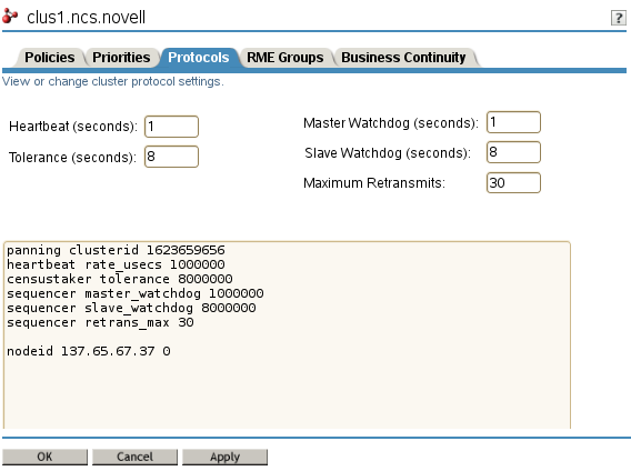 The Protocols page allows you to view or change cluster protocol settings such as heartbeat, tolerance, master/slave watchdogs, and maximum retransmits. The Protocols page also lets you view the script used to configure the cluster protocol settings, but not to change it. Changes made to the protocols setting automatically update the scripts.