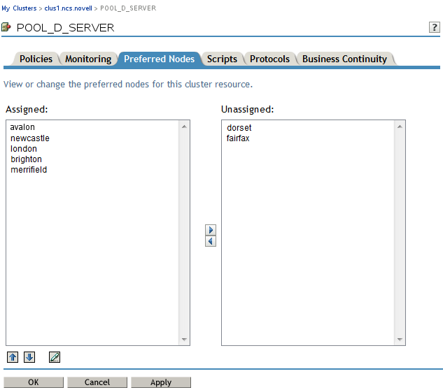 The Preferred Nodes page allows you to assign nodes to use for the resource. You also sequence the list of nodes to specify the preferred order that the nodes will be tried when a resource is brought online after its current node fails or if you do not specify a node when you bring the resource online. Changes are not allowed for the Preferred Nodes list for the Master_IP_Address_Resource.
