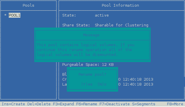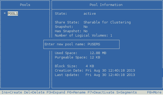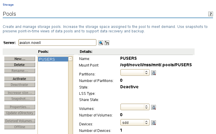 When an NSS pool is cluster-enabled with Novell Cluster Services, special steps must be followed to rename the pool. The pool cluster resource must be taken offline during the renaming process. You can use NSSMU or the Storage plug-in to iManager to rename the shared pool.