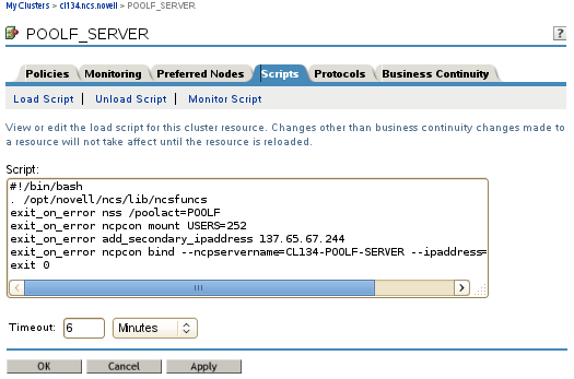 On the Load Script page, modify the volume name in the ncpcon mount command. Also check any custom commands where the volume name appears. If you modify the load script, click Apply.
